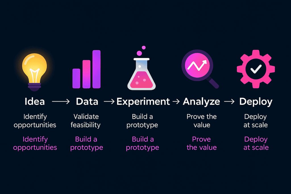 À travers une démarche progressive — Idea → Data → Experiment → Analyze → Deploy — nous vous permettons d’explorer les opportunités IA et Data sans prise de risque excessive, tout en gardant la maîtrise des coûts, des délais et des choix technologiques.